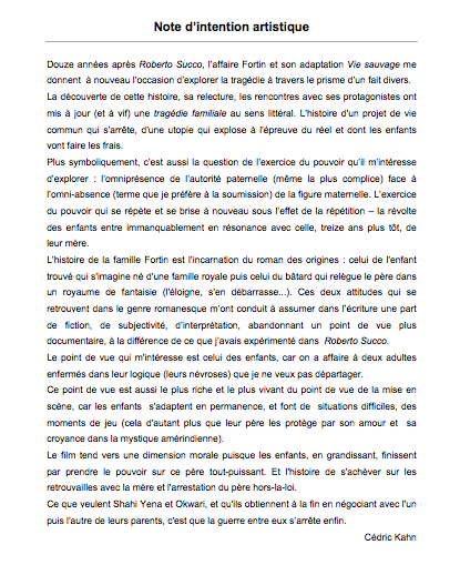 Une note d’intention est un court écrit dans laquelle le réalisateur explique pourquoi il a envie de faire ce film et comment il va essayer de le rendre visuellement.